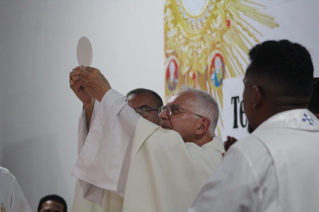Após a pregação, todos participaram de uma intensa e silenciosa Adoração ao Santíssimo Sacramento, conduzida pelo Pe. Joaquim Teixeira, marcada por profunda devoção e forte ação do Espírito Santo.