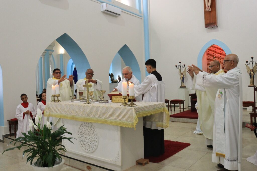 De volta à Catedral, o ápice da peregrinação foi celebrado: a Santa Missa, presidida por Dom Dominique You, bispo diocesano, e concelebrada pelos padres Raimundo Soares, Leonardo Miranda, Monsenhor Pedro Brito (todos da Catedral Nossa Senhora da Conceição) e Pe. Jailton Santos (Paróquia Senhora Santana).