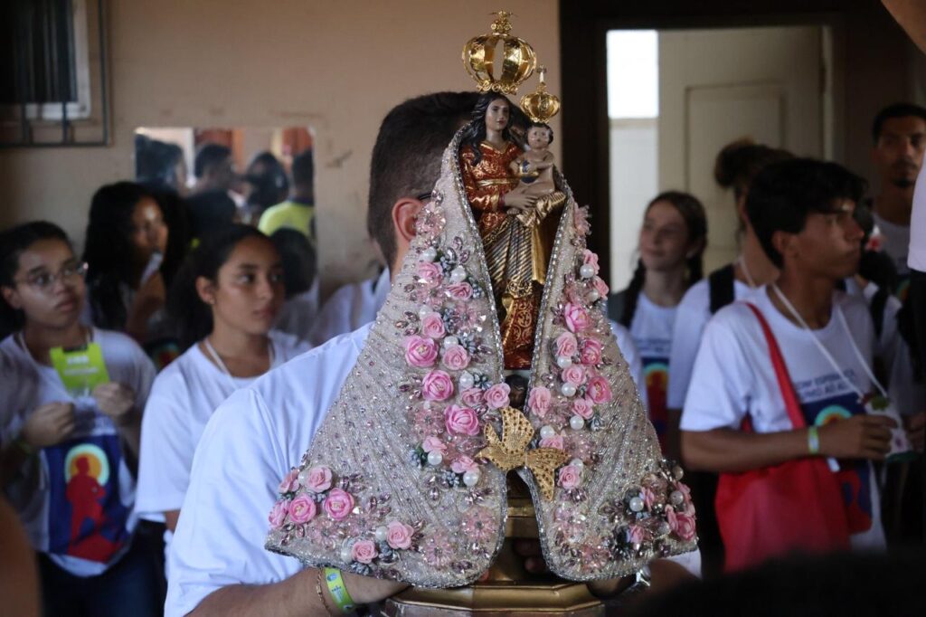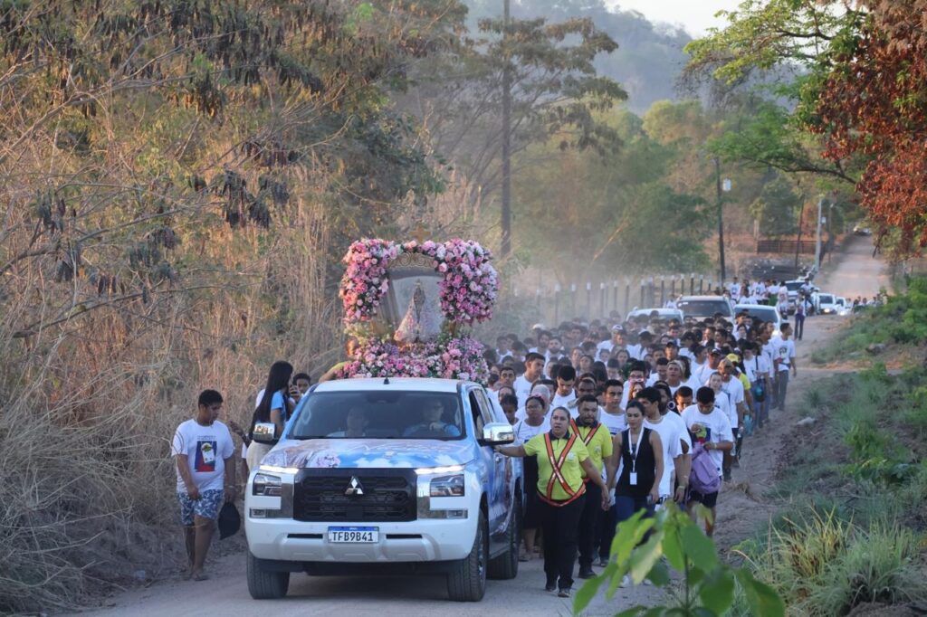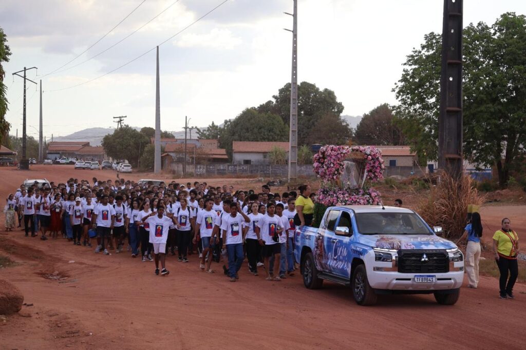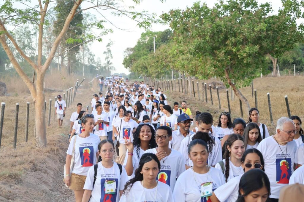 Na parte da tarde, os jovens participaram de oficinas temáticas nas salas da Escola Maria Benta, refletindo sobre espiritualidade, missão e vocação. Em seguida, a imagem peregrina de Nossa Senhora de Nazaré foi acolhida com emoção e fé, dando início à caminhada até a Fazenda da Esperança — um percurso de 8 km marcado por cantos, meditações e a reza do terço.